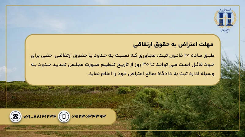 طبق ماده ۲۰ قانون ثبت، مجاوری که نسبت به حدود یا حقوق ارتفاقی، حقی برای خود قائل است می تواند تا ۳۰ روز از تاریخ تنظیم صورت مجلس تحدید حدود به وسیله اداره ثبت به دادگاه صالح اعتراض خود را اعلام نماید.