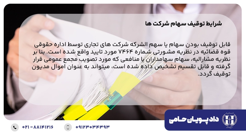 قابل توقیف بودن سهام یا سهم الشرکه در انواع شرکت های تجاری توسط اداره حقوقی قوه قضائیه در نظریه مشورتی شماره ۷۴۶۴ مورد تایید واقع شده است. بنا بر نظریه مشارالیه، سهام سهامداران یا منافعی که مورد تصویب مجمع عمومی قرار گرفته و قابل تقسیم تشخیص داده شده است، میتواند به عنوان اموال مدیون توقیف گردد.